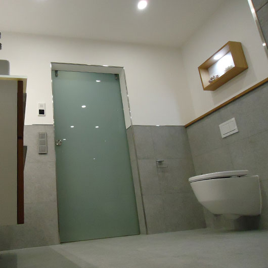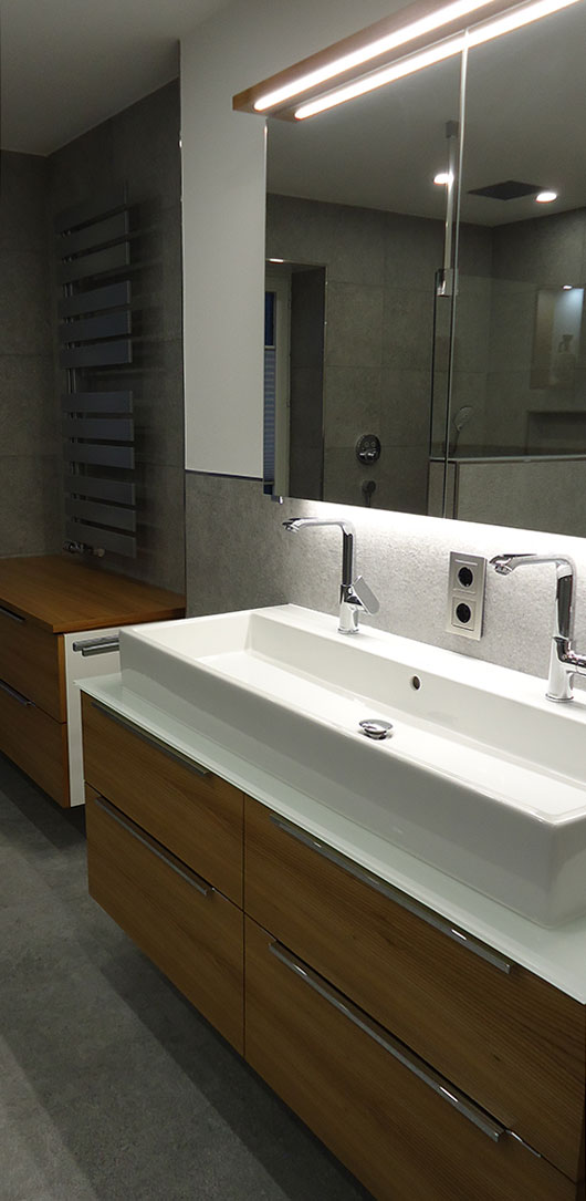 Zugunsten einer Walk-in Dusche entfiel bei diesem Bauvorhaben die Badewanne. Somit erscheint das neue Badezimmer viel großzügiger und die tägliche Dusche wird zum Erlebnis.